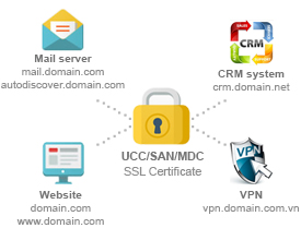 Cho phép hỗ trợ mã hóa nhiều tên miền khác nhau trong một chứng thư số SSL duy nhất. Chứng thư số SAN rất phù hợp khi bạn cần bảo vệ cho toàn bộ hệ thống máy chủ của công ty khi kết nối với Internet bao gồm: hệ thống mail server, website công ty, website bán hàng trực tuyến, hệ thống CRM, hệ thống E-Office, hệ thống VPN, hệ thống Video conference,...
