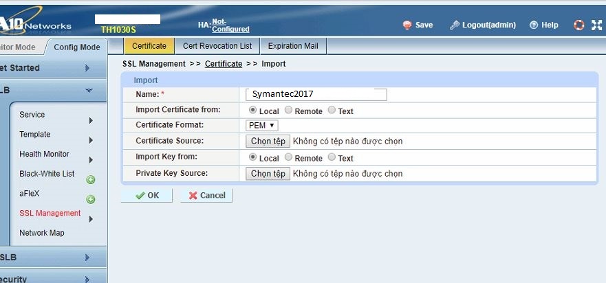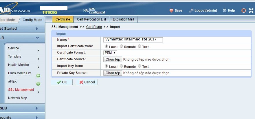Đăng nhập vào thiết bị với quyền Administrator. Sau đó truy cập vào mục SLB > SSL Management > Certificates. Nhấn nút Import.