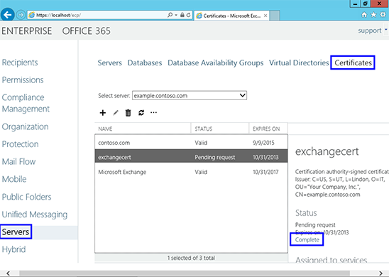 3. Chọn mục Servers trong menu bên trái, sau đó chọn mục Certificates trong menu phía trên bên phải. Chọn máy chủ phù hợp, sau đó chọn chứng thư số đang Pending (dựa vào Friendly Name bạn đã nhập vào khi tạo CSR). Lưu ý trạng thái của chứng thư số lúc này sẽ là Pending request. Nhấn mục Complete trong menu bên phải.