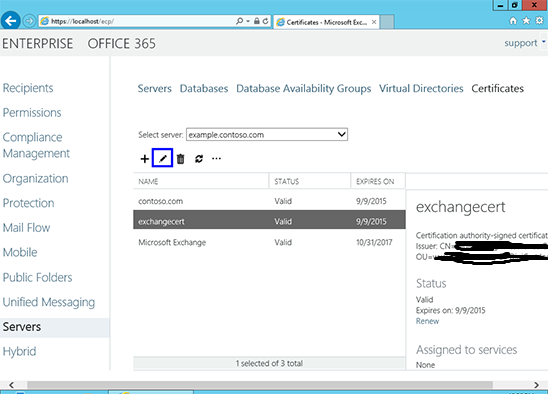 5. Lúc này trạng thái của chứng thư số sẽ chuyển từ Pending request sang Valid. Bạn sẽ thấy ngày hết hạn, danh sách tên miền trong chứng thư số. Lúc này, bạn cần gán các services của Exchange vào chứng thư số này. Bạn hãy chọn chứng thư số sau đó nhấn nút Edit.