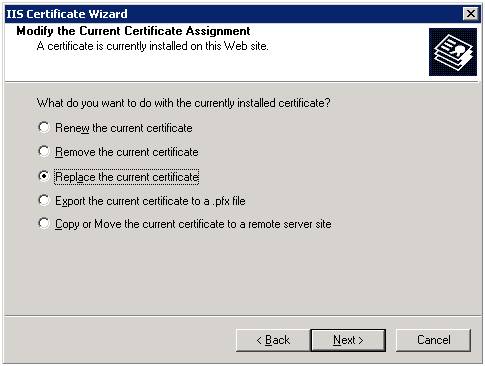 - Chọn website cũ và chọn mục “Replace current certificate”, sau đó chọn chứng thư số mới (bạn có thể để ý ngày hết hạn để tìm ra chứng thư mới).