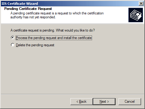 7. Chọn mục Process the Pending Request and Install the Certificate sau đó nhấn Next.