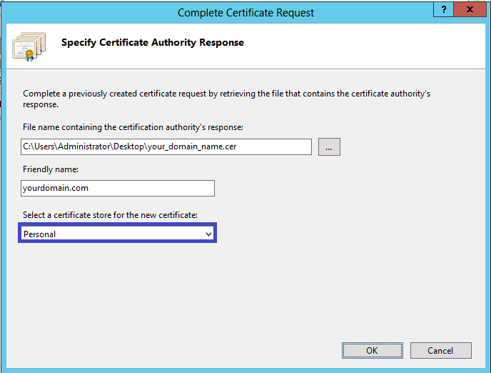 - Chọn đường dẫn đến file certificate.cer. Nhập vào tên gợi nhớ cho chứng thư số trong mục Friendly name. Lưu ý: Nếu bạn mua chứng thư số cho nhiều tên miền (SAN hoặc Wildcard), bạn cần phải thêm ký tự * vào đầu của Friendly Name, ví dụ *Symantec 2015. Khi đó bạn có thể chia sẻ chứng thư số này cho nhiều website được host chung trên máy chủ này. Chọn Personal Store. Sau đó nhấn OK.