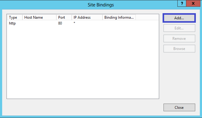 - Trong màn hình Site Bindings, nhấn Add. Lưu ý: Nếu bạn đang gia hạn chứng thư số cho website, thì trong màn hình này, bạn chọn dòng "https" và sau đó nhấn Edit.