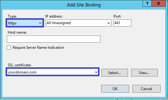 - Trong màn hình Add Site Bindings, chọn "https" trong mục Type, chọn Port cần chạy SSL (443), nhập vào tên miền của website trong mục Host Name, cuối cùng chọn chứng thư số vừa cài đặt trong bước trước đó. Sau đó nhấn OK. Lưu ý: Nếu bạn muốn chia sẻ nhiều chứng thư số cho một địa chỉ IP, bạn cần chọn mục "Require Server Name Indication".