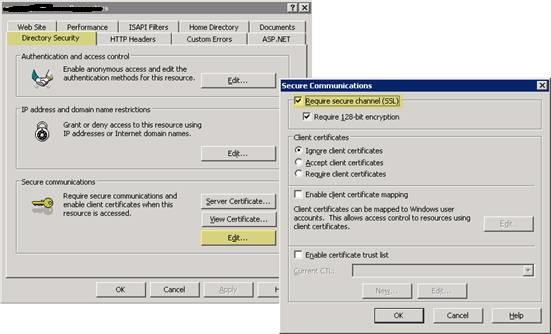 2. Trong màn hình Properties, chọn tab Directory Security. Trong mục Secure Communications, nhấn nút Edit. Trong màn hình Secure Communications, nhấp chọn mục Require secure channel (SSL). Sau đó nhấn OK.