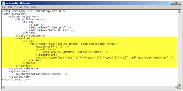 <rule name="Redirect to HTTPS" stopProcessing="true">
