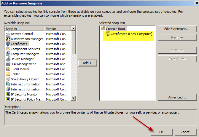 7. Trong khung bên phải, kiểm tra lại xem mục Certificates đã được thêm vào chưa. Sau đó nhấn OK.