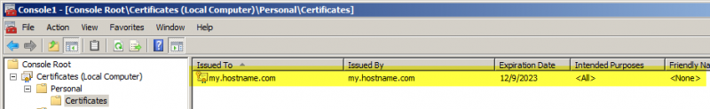 14. Lúc này, chứng thư số sẽ xuất hiện trong mục Personal > Certificates. Bạn cũng sẽ thấy chứng thư số này xuất hiện khi Binding SSL cho website trong IIS.