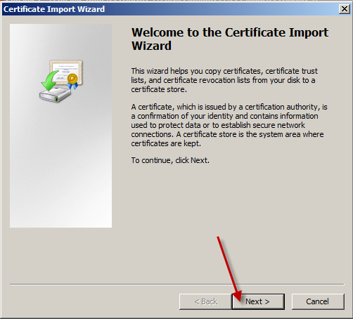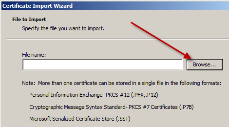 10. Nhấn Browse và trỏ đến vị trí lưu file PFX trên server, sau đó nhấn Next.
