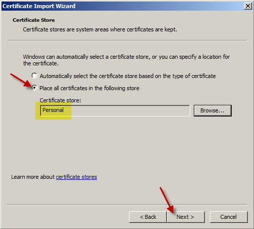 12. Chọn Place all certificates in the followiing store. Đảm bảo bạn đã chọn Personal trong mục Certificate store. Nhấn Next.