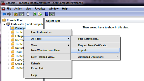 8. Từ màn hình Certificate Snap-in, nhấp chuột phải vào mục Personal và chọn All Tasks > Import