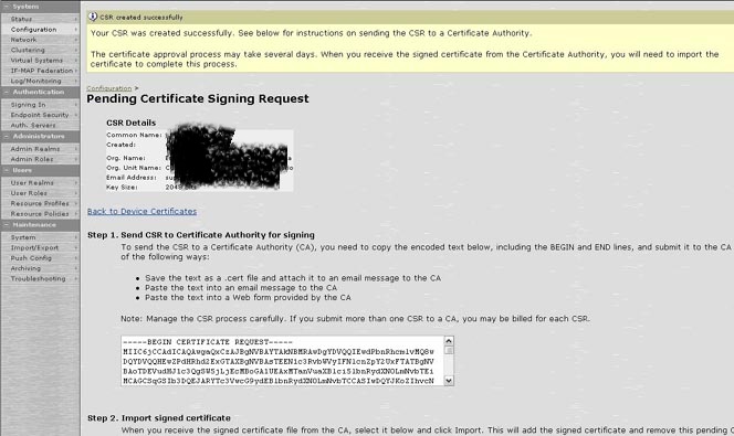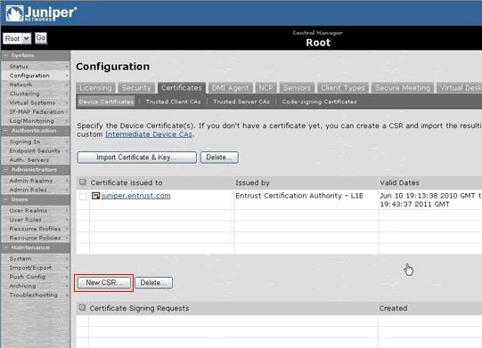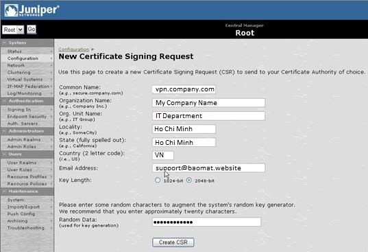 Để tạo CSR cho Juniper Secure Access (Juniper SA), bạn thực hiện như sau: