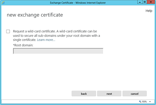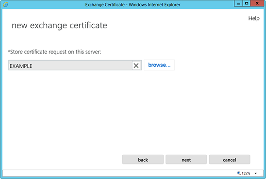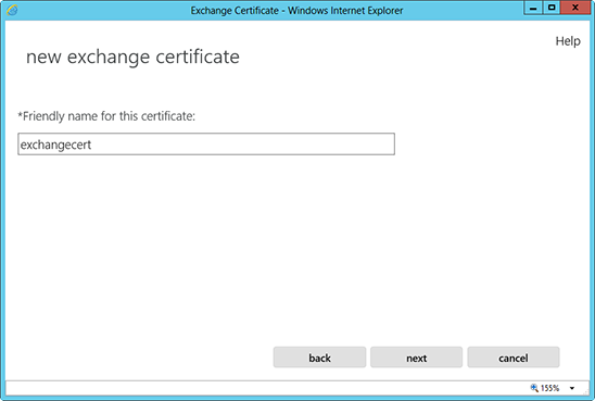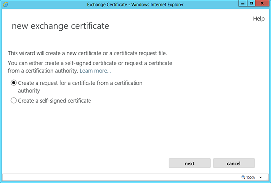 4. Màn hình "New Exchange Certificate" sẽ xuất hiện. Chọn "Create a request for a certificate from a certification authority".