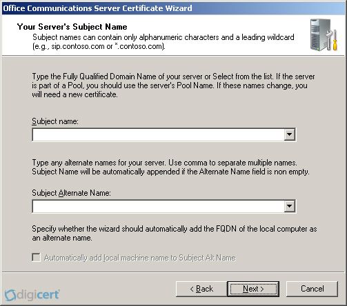 10. "Subject Name" nhập vào tên miền chính của chứng chỉ số. Lưu ý chỉ nhập tên miền (ví dụ mail.company.com), không nhập https:// .Chọn "Automatically add local computer name", và click Next.