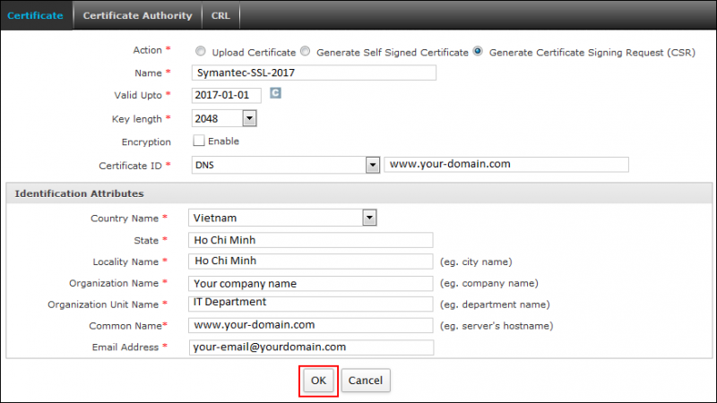 2. Trong màn hình tiếp theo, chọn Generate Certificate Signing Request (CSR) và điền thông tin vào form như bên dưới: Sau đó nhấn OK.