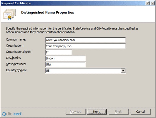 6. Trong màn hình "Distinguished Name Properties", nhập vào các thông tin sau đây: