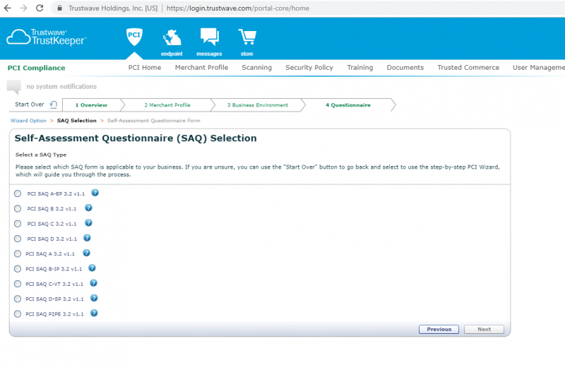 Trong thời gian chờ đợi Trustwave hoàn tất quá trình quét, bạn có thể hoàn tất SAQ (Self-Assessment Questionnaire). Tùy vào yêu cầu cụ thể của đối tác thanh toán, mà bạn sẽ chọn loại SAQ phù hợp.